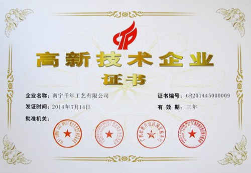 (本網(wǎng)訊) 熱烈慶祝集團(tuán)公司------千年工藝獲得了由廣西科技廳、廣西財(cái)政廳、廣西國稅局、廣西地稅局聯(lián)合頒發(fā)的“高新技術(shù)企業(yè)證書”,成為廣西2014年首批國家級高新技術(shù)企業(yè)之一。